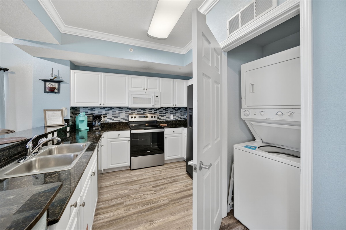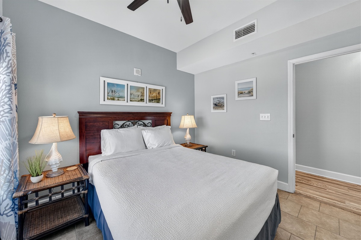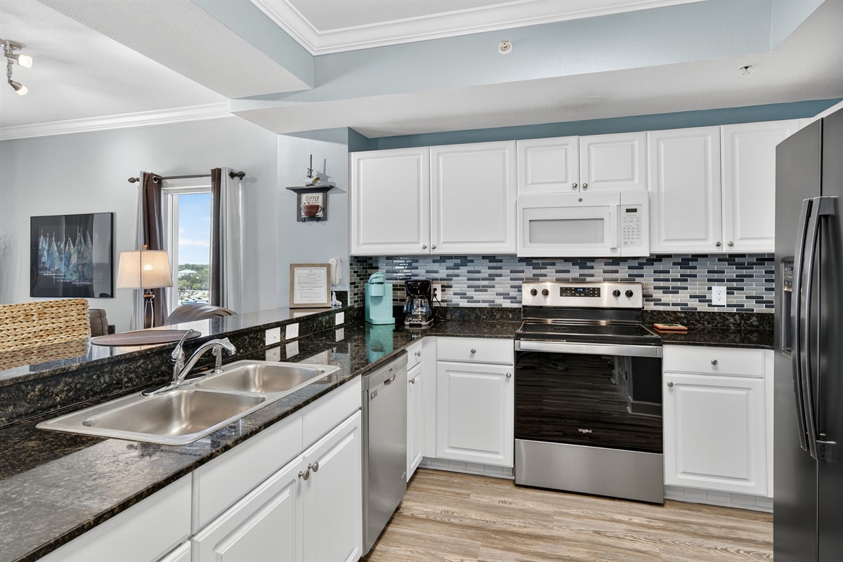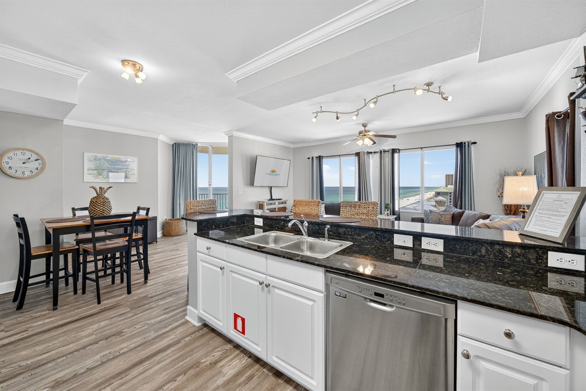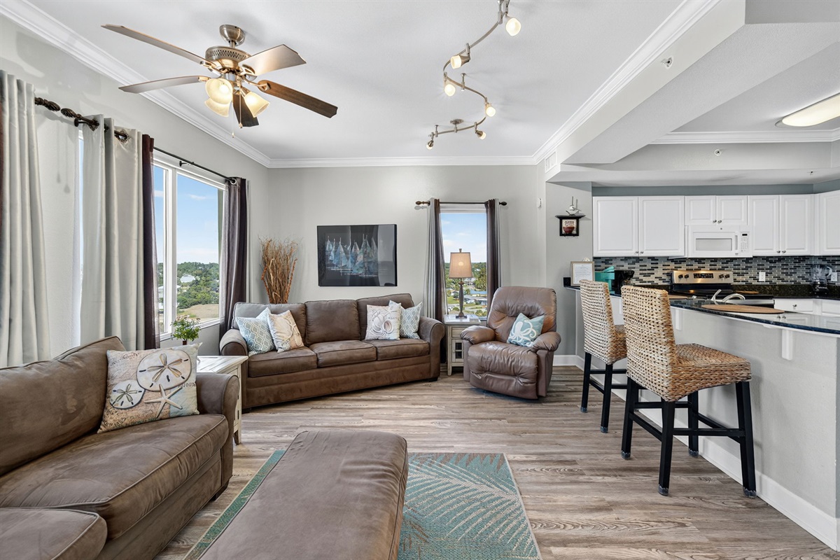 The condo sleeps 6 with a king bed in master, queen in guest bedroom, and queen sleeper sofa. There are two full bathrooms with newly tiled walk in showers. The kitchen is fully stocked with all your cooking needs to fee the family.